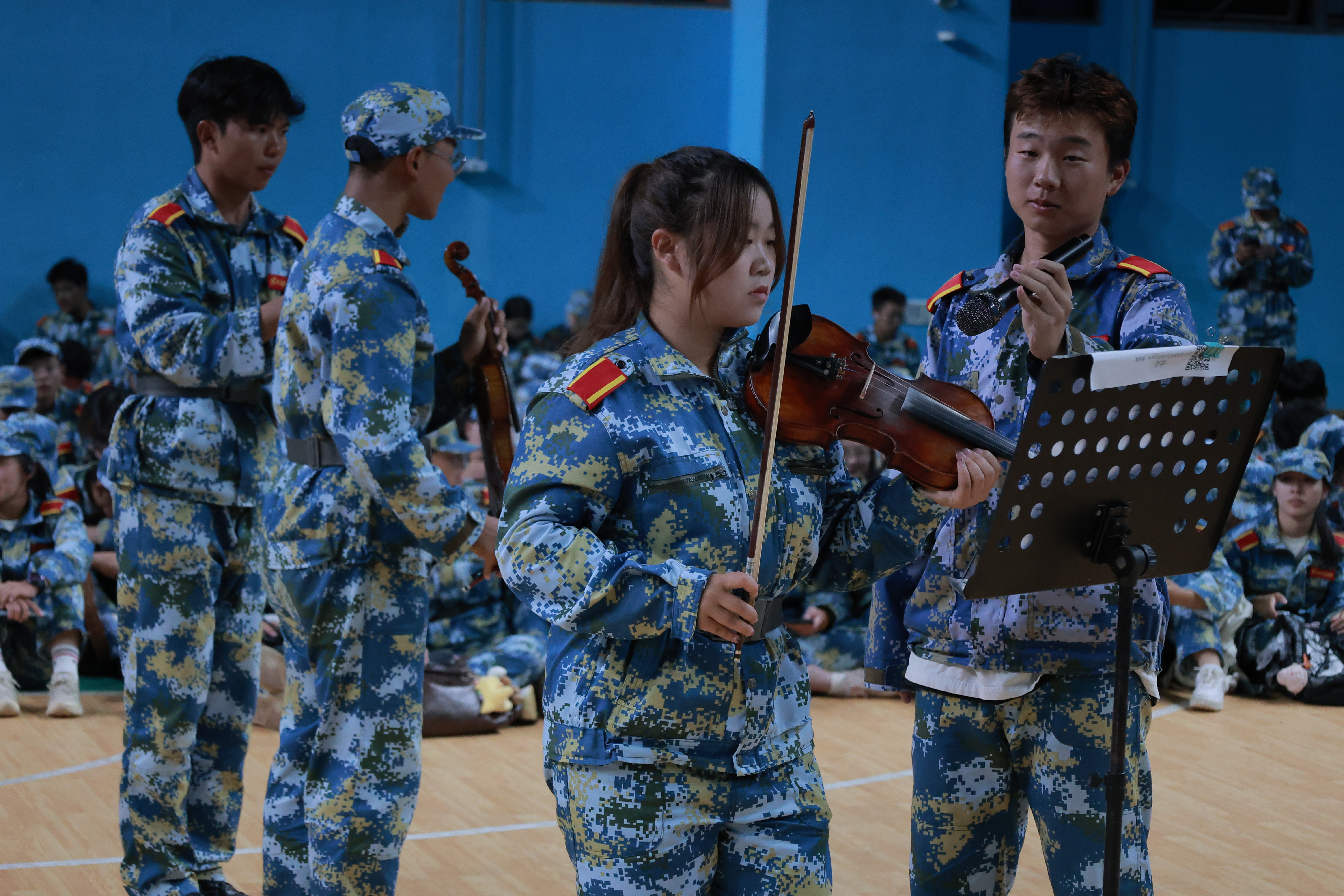 夕阳渐隐,夜幕轻垂,往日严肃的训练场被璀璨的灯光与热烈的欢呼点燃,汇成一片欢乐的海洋。同学们手中挥舞的闪光灯如繁星闪烁,与皎洁月光交相辉映。晚会在李忠武与胡芳源同学深情演绎的《她说》中正式启幕。温暖的旋律瞬间俘获全场,也唤醒了我们炽热的青春与澎湃的豪情。