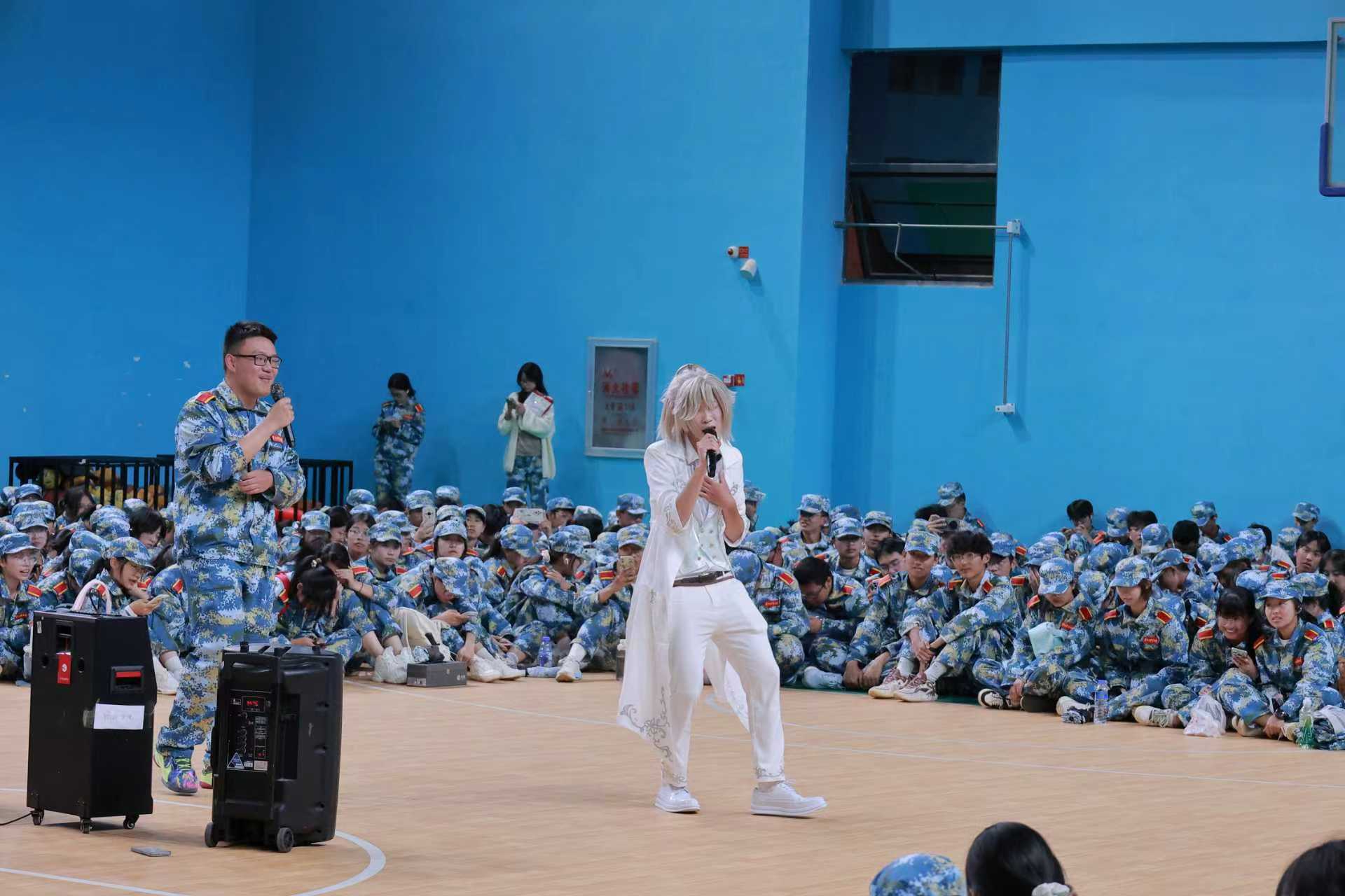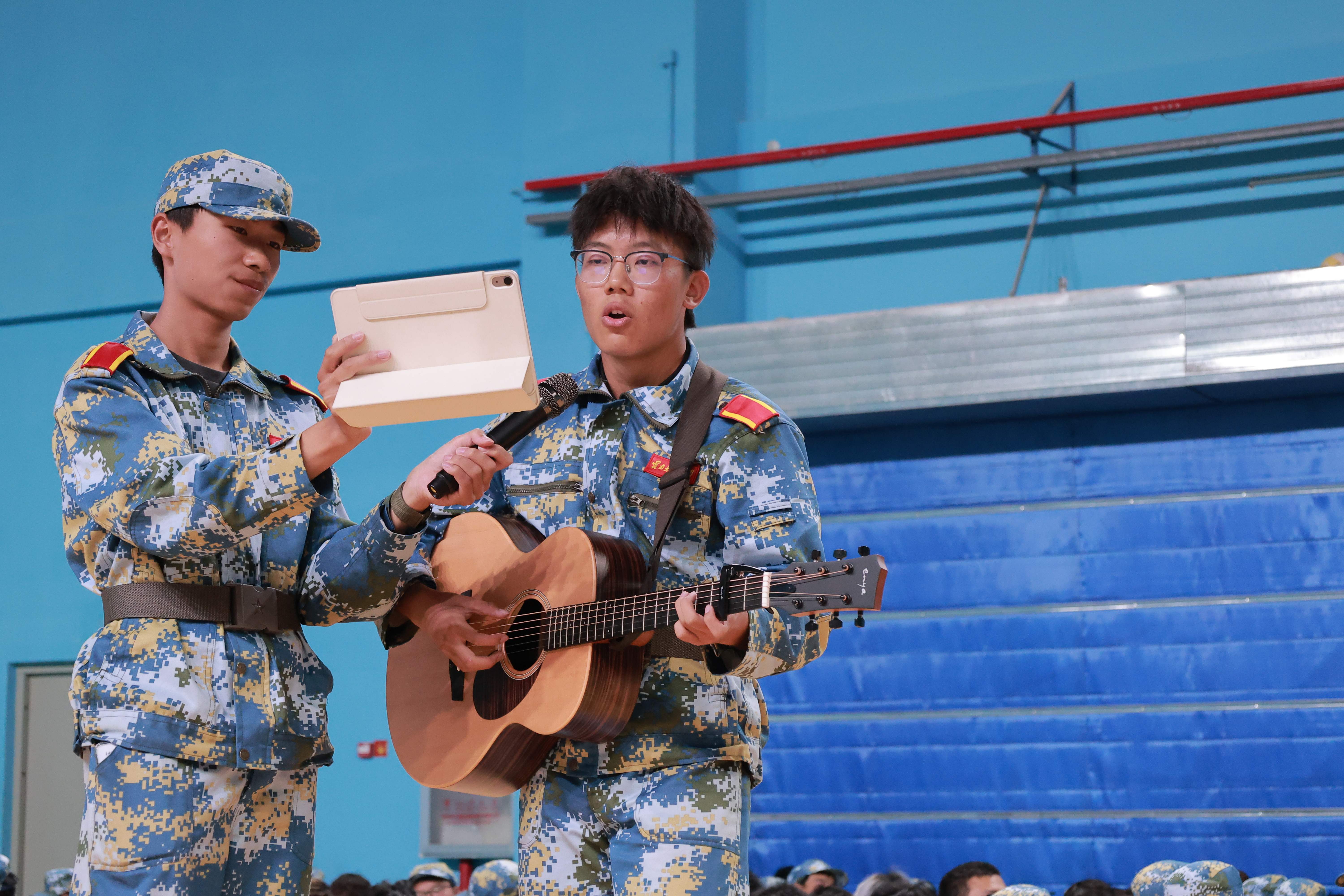 整场晚会节目形式多样、精彩不断,充分展现了新一代学子多才多艺、自信昂扬的精神风貌。令人尤为难忘的,是石堃同学怀抱吉他静坐舞台中央,轻轻弹唱《蒲公英的约定》的画面。那一刻,全场仿佛沉浸于一个温柔的梦境,追光灯下,清澈的嗓音与轻柔的琴弦交织,如夏夜微风,拂过每个人的心间。台下,无论是身着迷彩的同学,还是平日严肃的教官,皆静心聆听,脸上浮现出触动与共鸣的微笑。