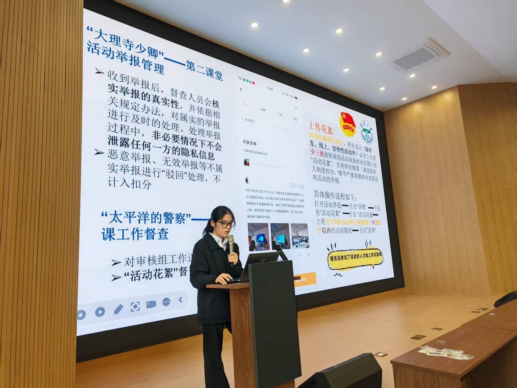校二课四大核心组——审核组、督查组、宣传组、数据组也分别登台,介绍了各自职能。审核组负责活动审核与补录;督查组聚焦活动质量与失信管理;宣传组通过公众号推送活动预告、月报及原创内容;数据组则依托大数据分析,为学生个性化发展提供支持。各组协同运作,共同保障第二课堂有序、高效、公正地运行。