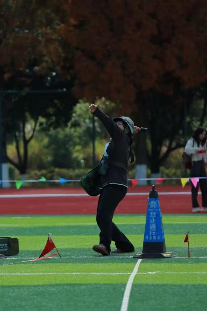 在手榴弹投掷赛区,红白旗刚标定距离刻度,我院迟静雯、牛睿彤、李佳聪、邓毅川四位同学便展开角逐。其中,迟静雯同学立姿助跑,挥臂掷出,手榴弹划过一道18.37米的精准弧线落地,最终位列女子组第七。这一掷,是她将“稳”与“准”刻入动作的证明。