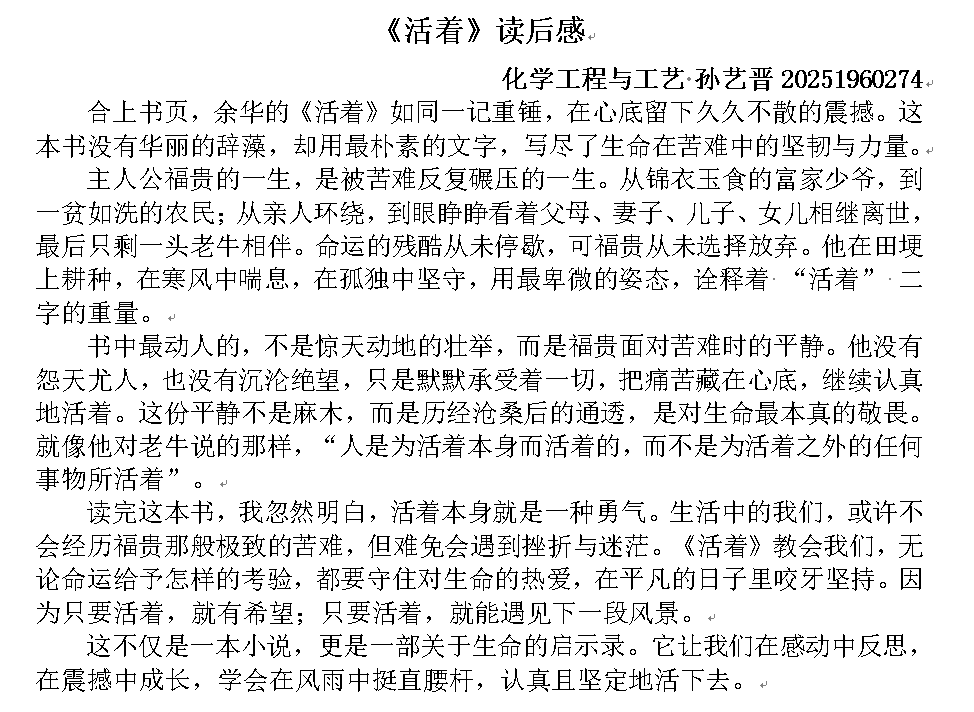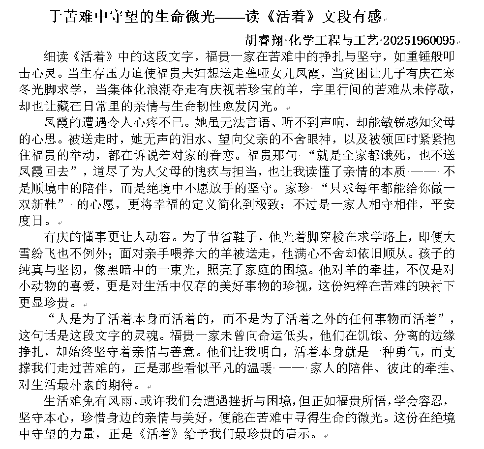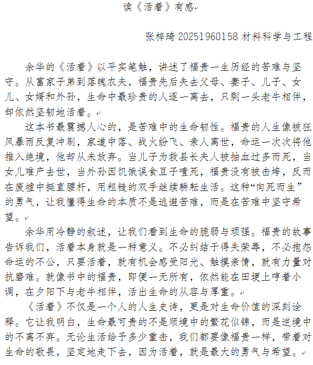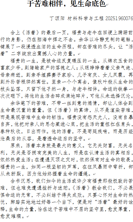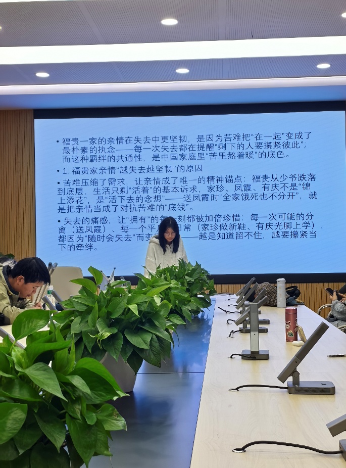 在“自主阅读”环节中,同学们静心沉浸于《活着》的字里行间,在书页上认真标记触动心灵的段落。“故事与感悟”分享时,现场气氛热烈而真挚。尚雨欣同学结合自己的家庭故事,动情地谈到祖辈在动荡岁月中“像福贵一样,咬着牙把日子过下去”的真实经历,感慨道:“《活着》中的苦难并非遥远的故事,而是我爷爷奶奶茶余饭后轻描淡写的人生。”李佳聪分享了自己的见解,认为福贵所展现的生命“韧性”,并非是与苦难的对抗,而是“带着苦难继续前行”。这种朴素而深刻的生命观,恰恰体现了中国人最动人的生活智慧。