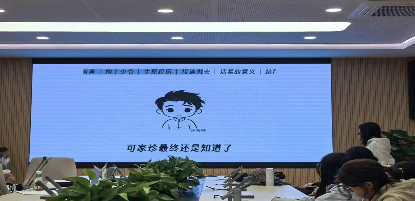 活动伊始,领读人朱芯仪同学便引领读者步入“作品与时代”的时空长廊。一段精心剪辑的视频,如同钥匙,开启了通往旧日岁月的大门。在光与影的流淌中,《活着》的创作背景与余华冷峻的笔触渐次清晰,而福贵从富庶坠入落魄、从团圆走向孤寂的一生,更与宏大的历史叙事同频共振。现场在无声的凝视中沉静下来,一种跨越时代的悲悯与厚重在空气中弥漫,为接下来的思想交锋悄然铺陈了深沉的情感底色。