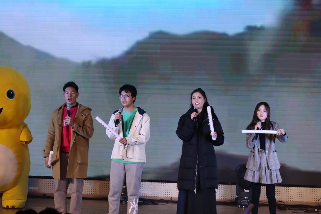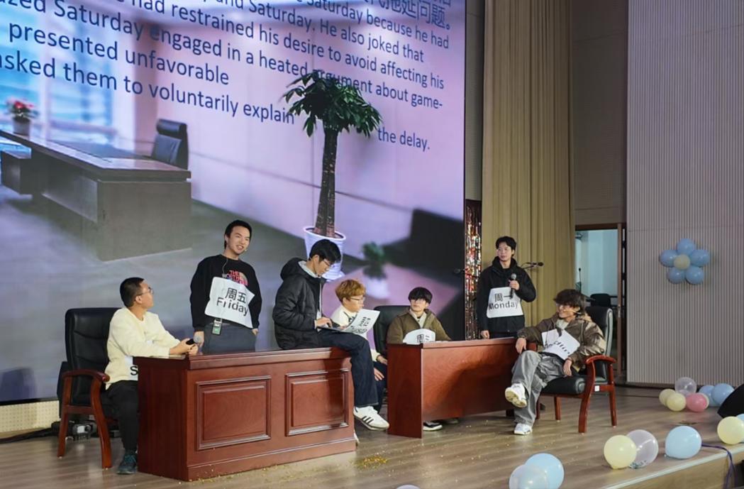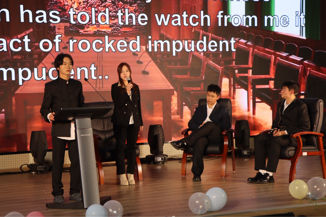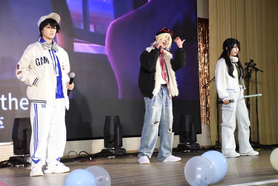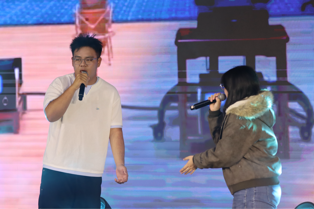 陌生在活力中褪去,热爱于共鸣中登场。第二篇章“青春同频·语通世界”精彩纷呈。学院学生会文艺部舞蹈队以舞蹈串烧《TEN PERCENT》瞬间点燃全场热情;学院团委组织部带来小品《谁杀死了周日》,以密集笑点精准戳中校园生活的趣味日常;单叙潼、苏欣颐联袂带来经典歌曲《Love the Way You Lie》,二人默契对唱,将歌曲的韵味娓娓道来;学院学生会科创部带来温情合唱《金鹰卡通》,唤醒了所有人的童年记忆;学院青年志愿者协会带来朗诵与合唱相结合《青春有你》,将公益初心与青春担当娓娓道来,为篇章画上温暖句点。同时,篇章尾声设置猜词游戏环节,台下观众踊跃抢答。