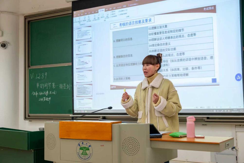 2025年12月5日及12月7日晚,云南马来亚学院语言中心邀请外国语学院深耕英语教学多年的丁惠民老师、王坚老师,为同学们开展了CET4备考技巧指导课程,吸引了三个专业的同学参与。